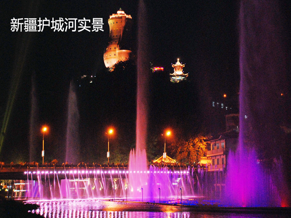 新疆護城河音樂噴泉通過程序控制系統和音樂控制系統,對音樂進行編程,使噴泉造型與音樂旋律、燈光同步結合而產生千變萬化的水景,高端大氣..